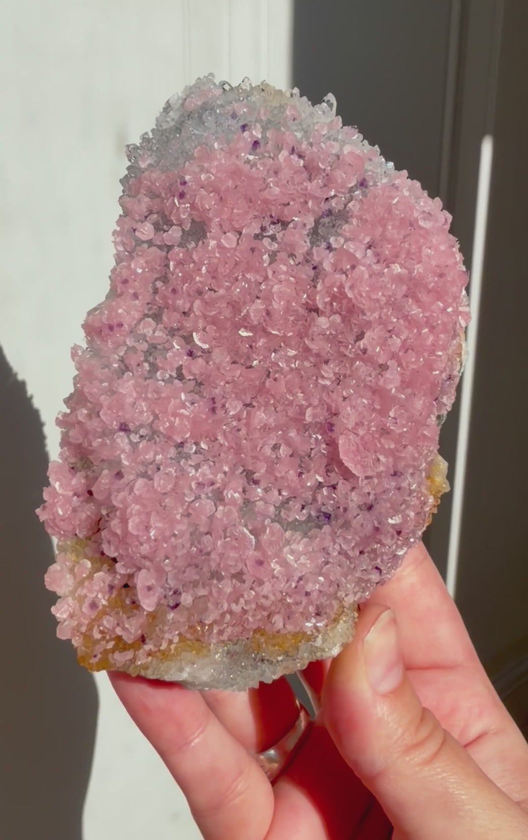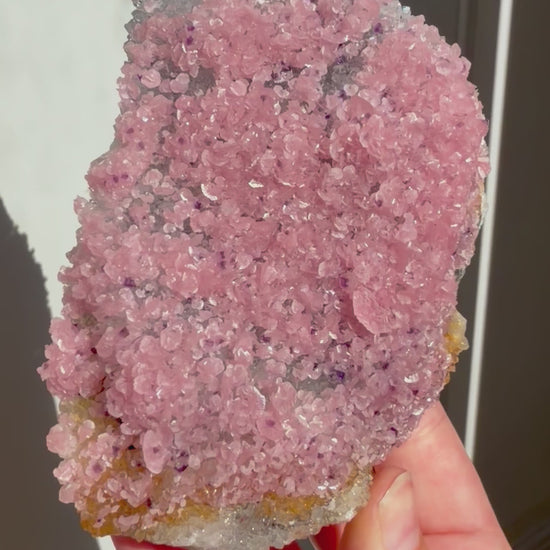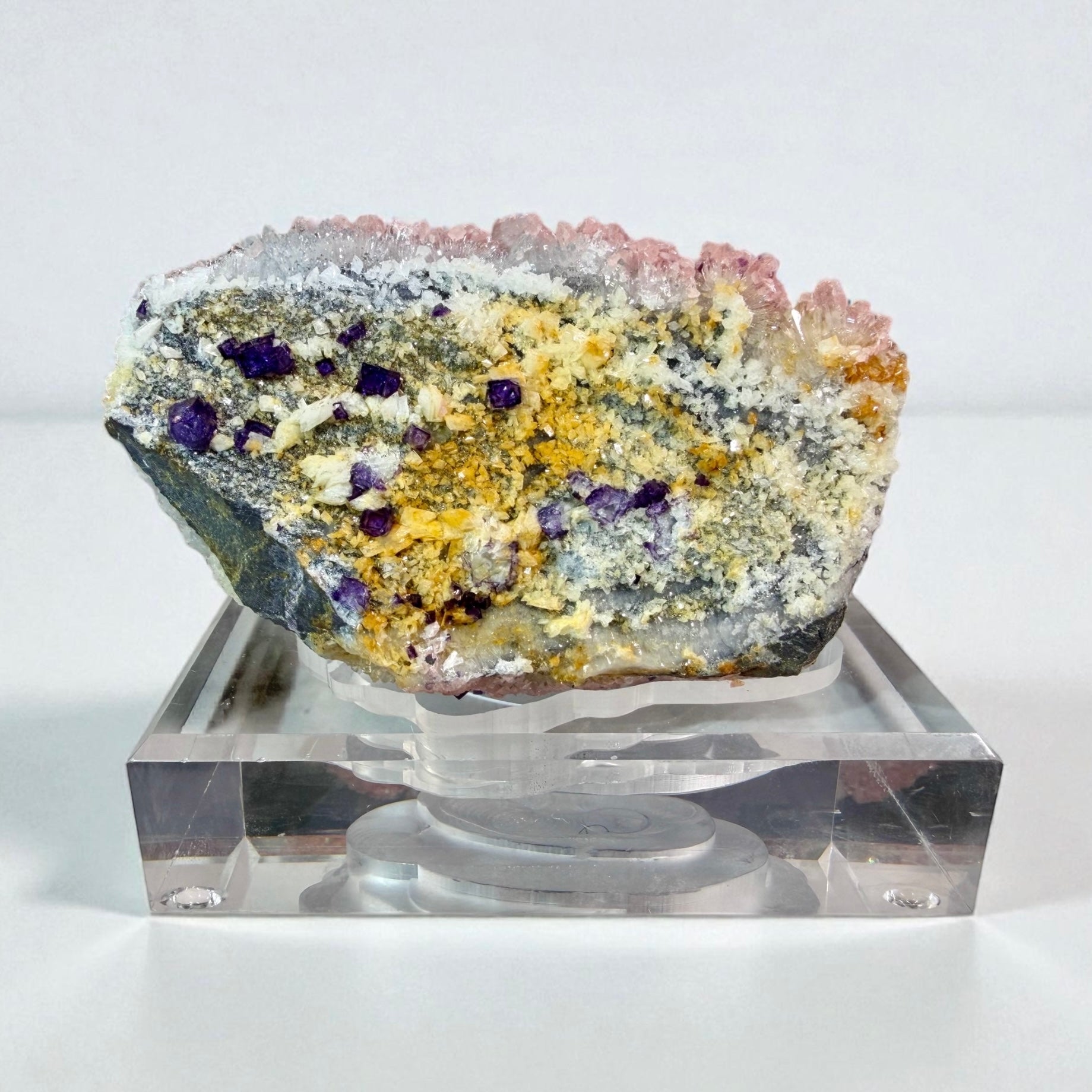 This specimen features a dense coverage of sparkling pink bladed rhodochrosite microcrystals across the display face, forming a shimmering blanket with excellent luster and color. Beneath the rhodochrosite layer, you can see well-developed blue-toned transparent quartz crystals. Scattered throughout the matrix are sharp purple cubic fluorite crystals, accompanied by white barite, yellow iron oxide accents and fine-grained pyrite.