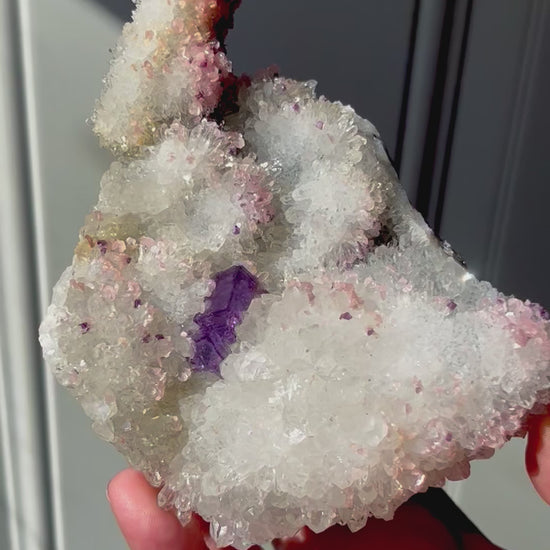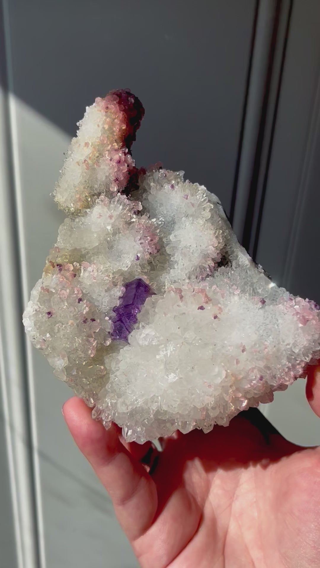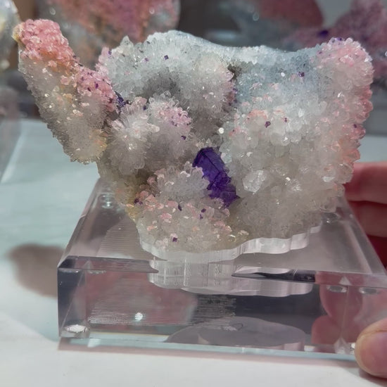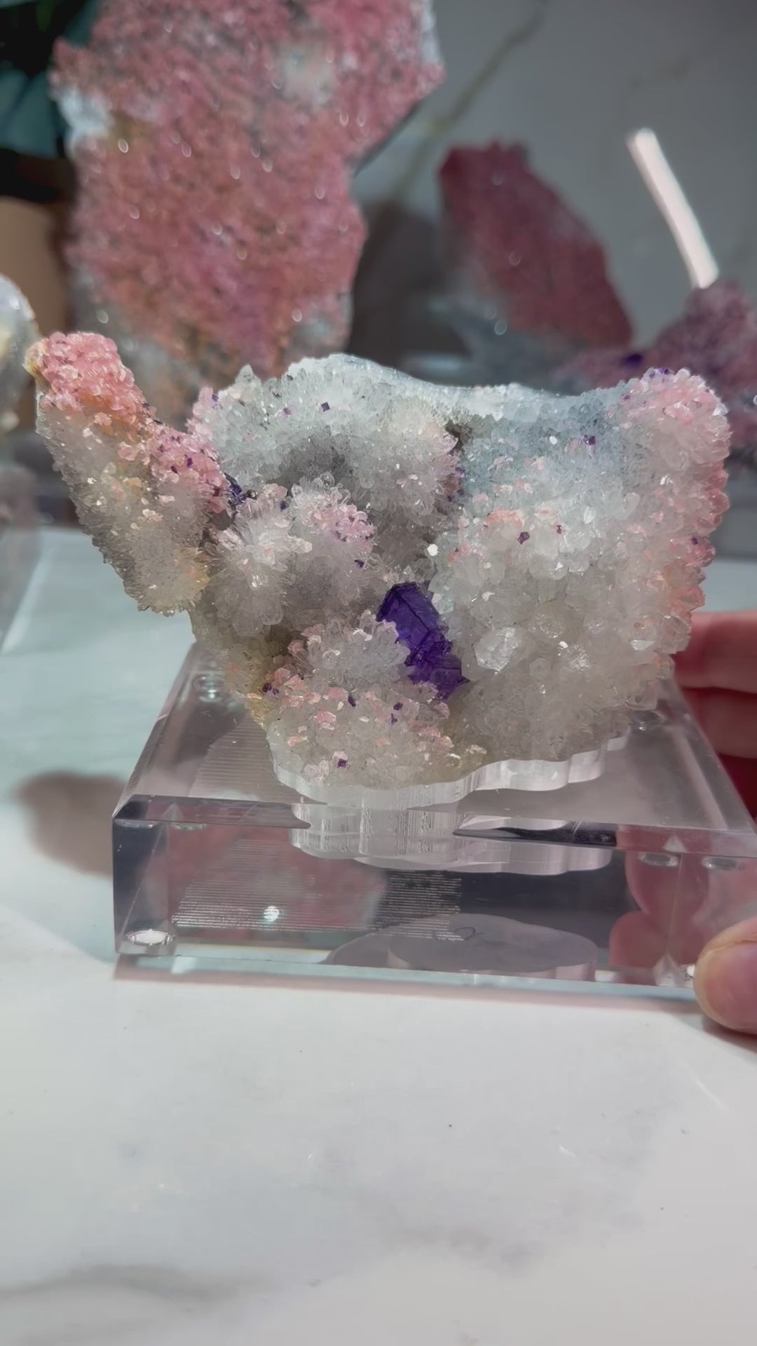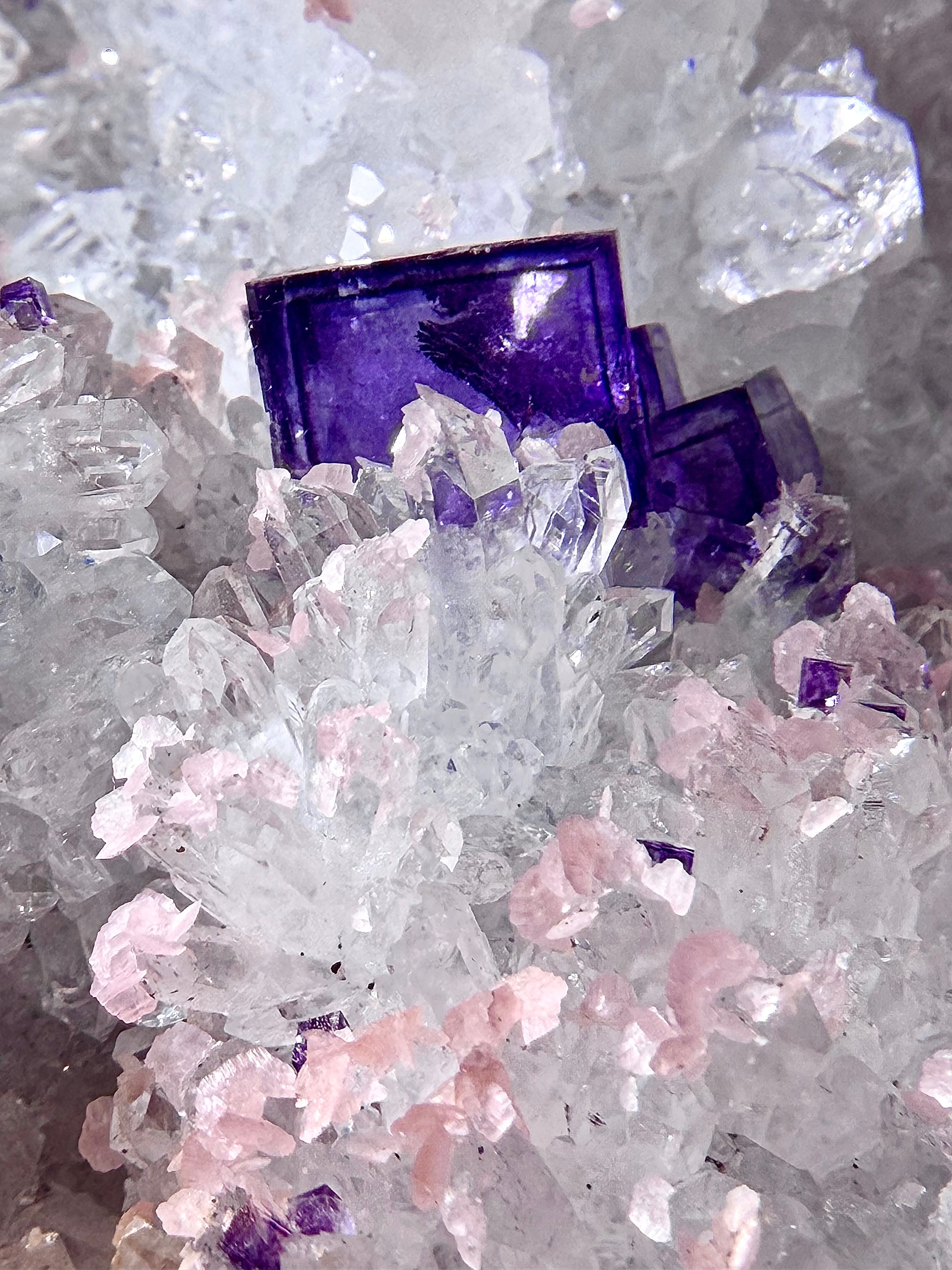 This piece showcases a delicate interplay of color and texture. Sparkling pink rhodochrosite microcrystals dot the surface of transparent quartz clusters, whose radiating growth habit gives the piece a frosted, crystalline sheen. Scattered among the quartz are sharp purple fluorite cubes, their saturated hue providing striking contrast against the bright quartz.