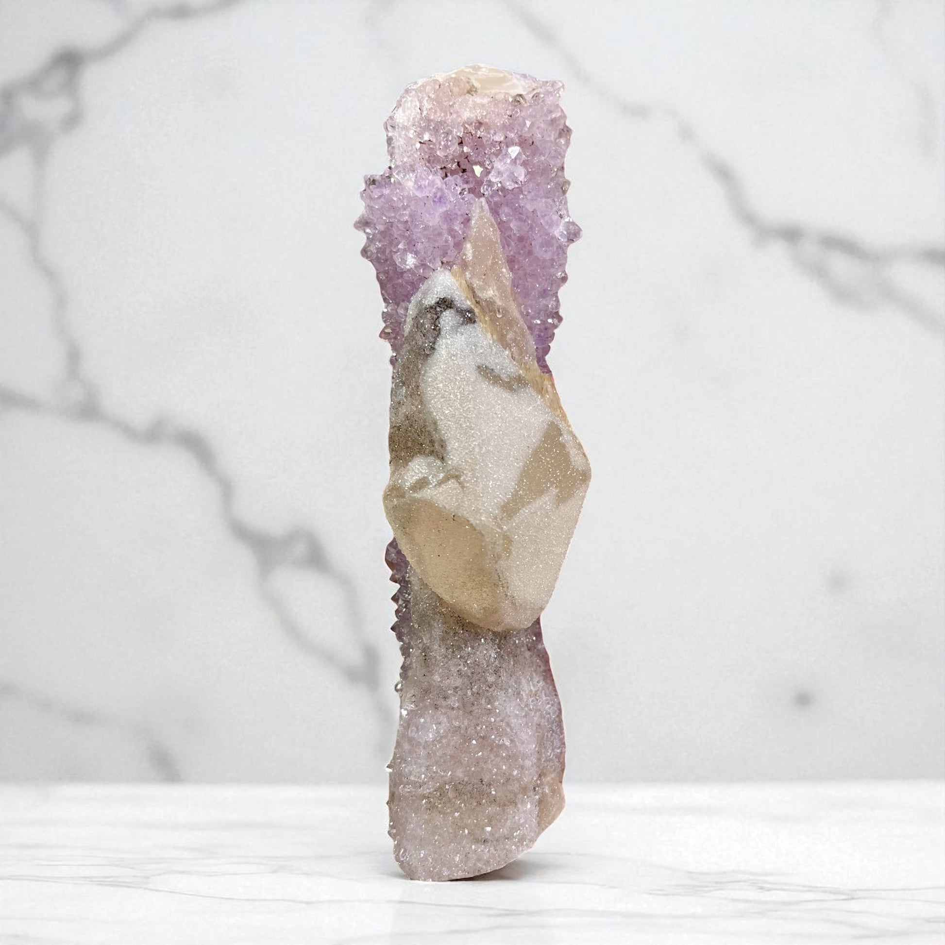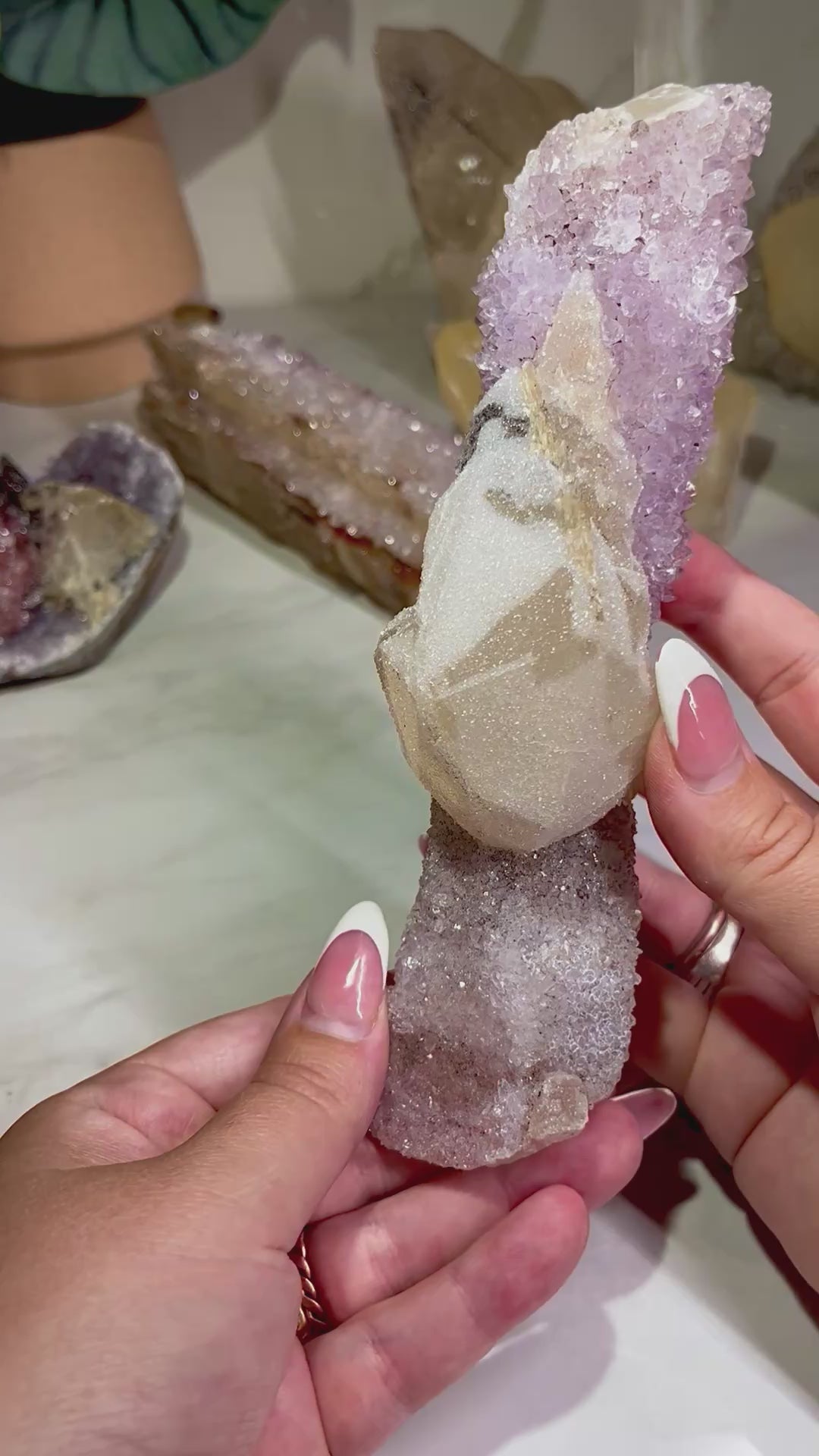A sculptural specimen from the famed amethyst mines of Artigas, Uruguay. This elongated calcite crystal is coated in a delicate lilac amethyst crust, with a secondary calcite crystal dramatically attached on the front. Both are sprinkled in a sugary layer of quartz druse, giving the entire piece a radiant sparkle from every angle. This piece has serious princess vibes!