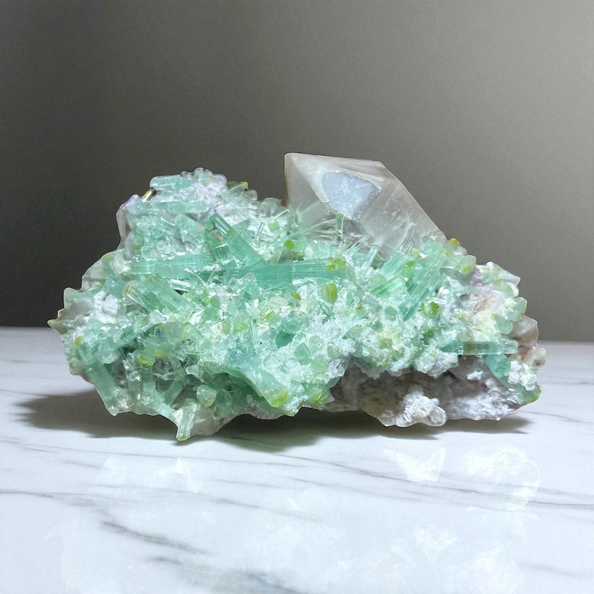 This striking specimen showcases an exceptional cluster of seafoam green to blue tourmaline crystals radiating in perfect transparency and luster. The delicate, elongated prisms are intergrown with several well-formed quartz points, including a prominent smoky quartz, creating a highly aesthetic and balanced composition. Scattered among the tourmalines are soft lavender tones of lepidolite, providing a subtle, sparkling backdrop that enhances the vivid coloration of the piece.