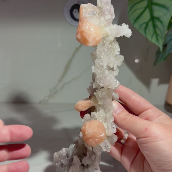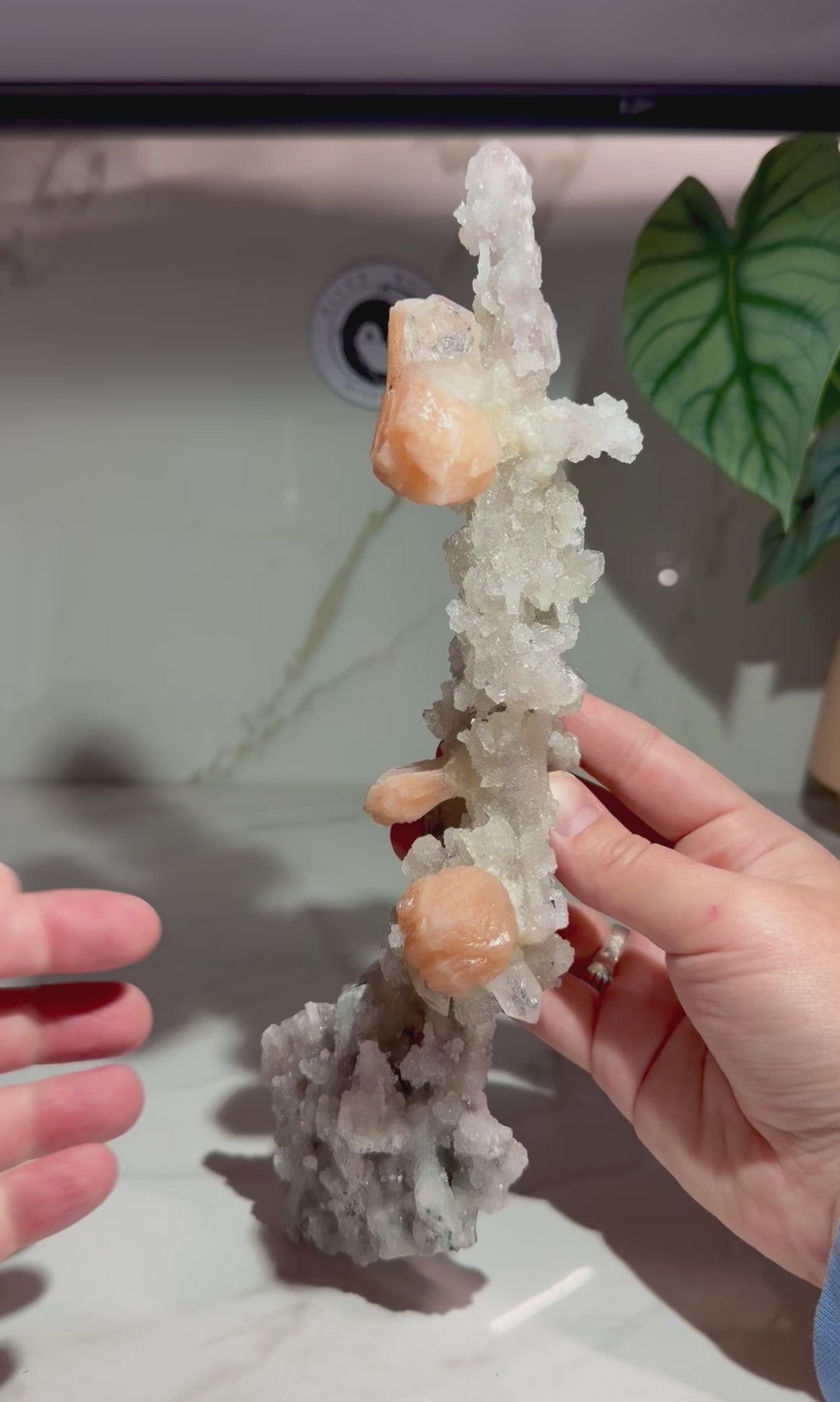 A tall, slender chalcedony stalactite with an icy sparkle and multiple peach stilbite accents stepping up the length of the piece. There’s a clean vertical line to this one that looks incredible from the side with apophyllite and druzy texture throughout the chalcedony.