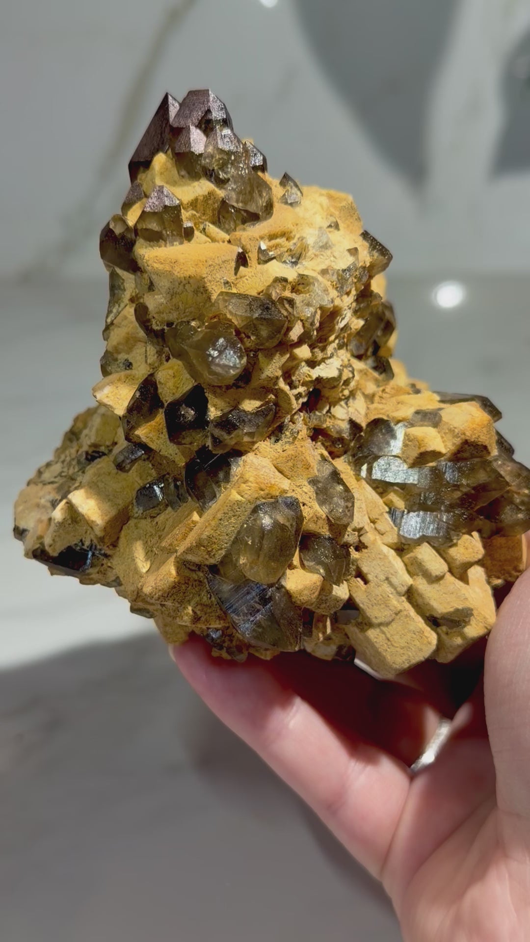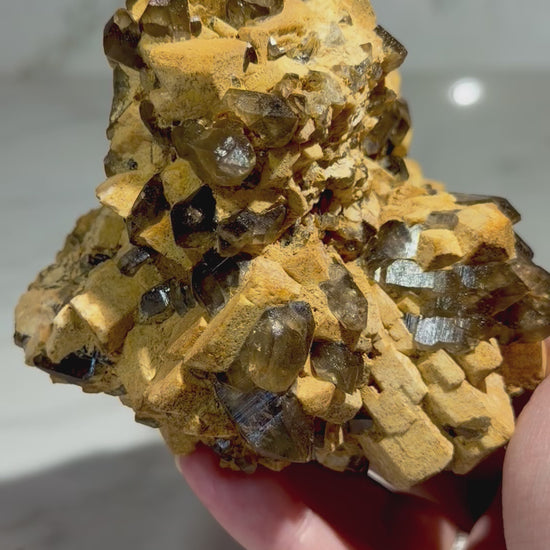 - Multiple smoky quartz crystals with natural, deep brown saturation