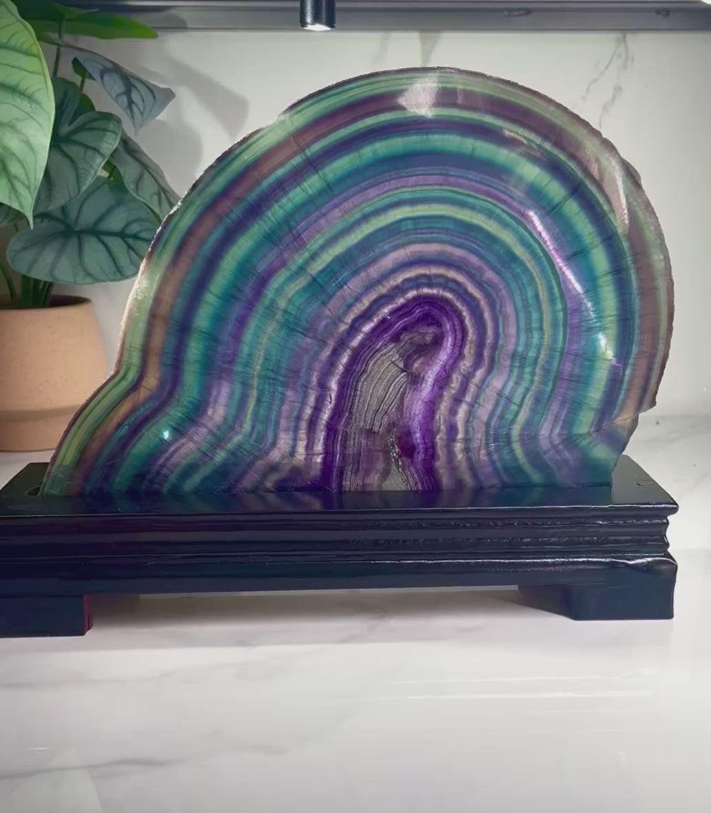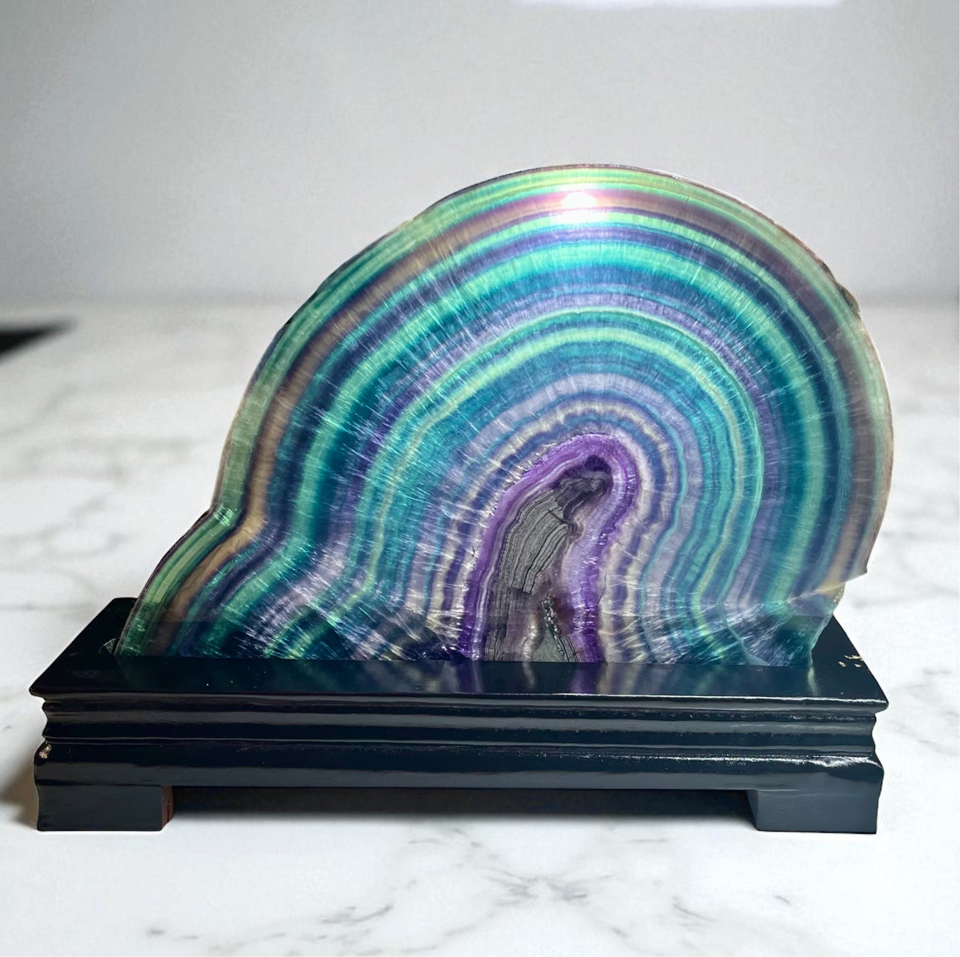 A radiating botryoidal rainbow fluorite slab displaying vivid concentric bands of teal, green, purple, and blue. The natural layers radiate outward like ripples in water, pulling the eye toward its deep violet center. Mounted on a sleek black wooden base, this piece is ideal as a collector’s display, desk accent, or statement décor.