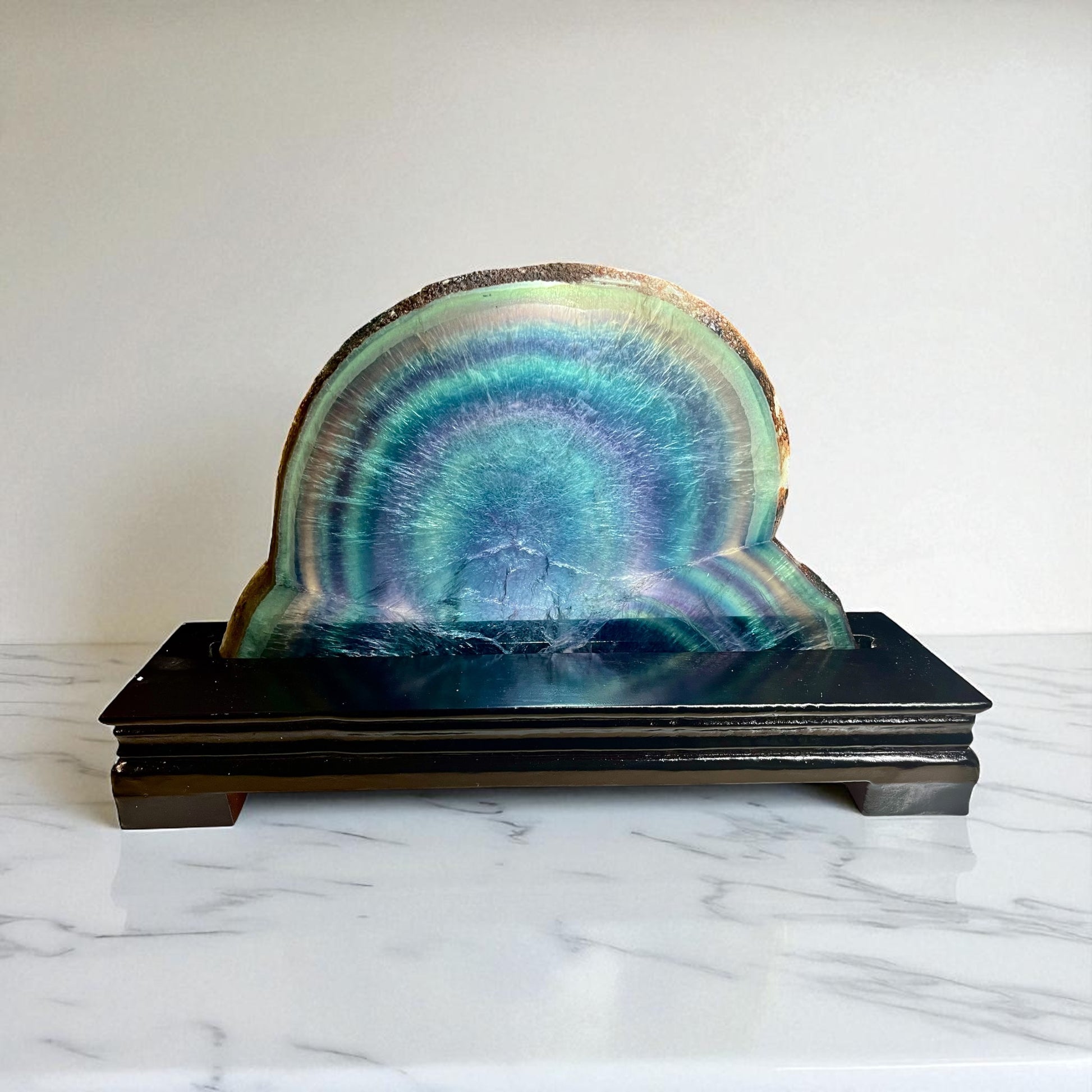 This large rainbow botryoidal fluorite slab glows with luminous color zoning, blending cool greens and blues with soft purples in an almost halo-like formation. Its wide, open pattern displays an ethereal quality when lit, emphasizing the translucent, vivid layers within. Resting on a polished wooden base, it is both refined and grounding.