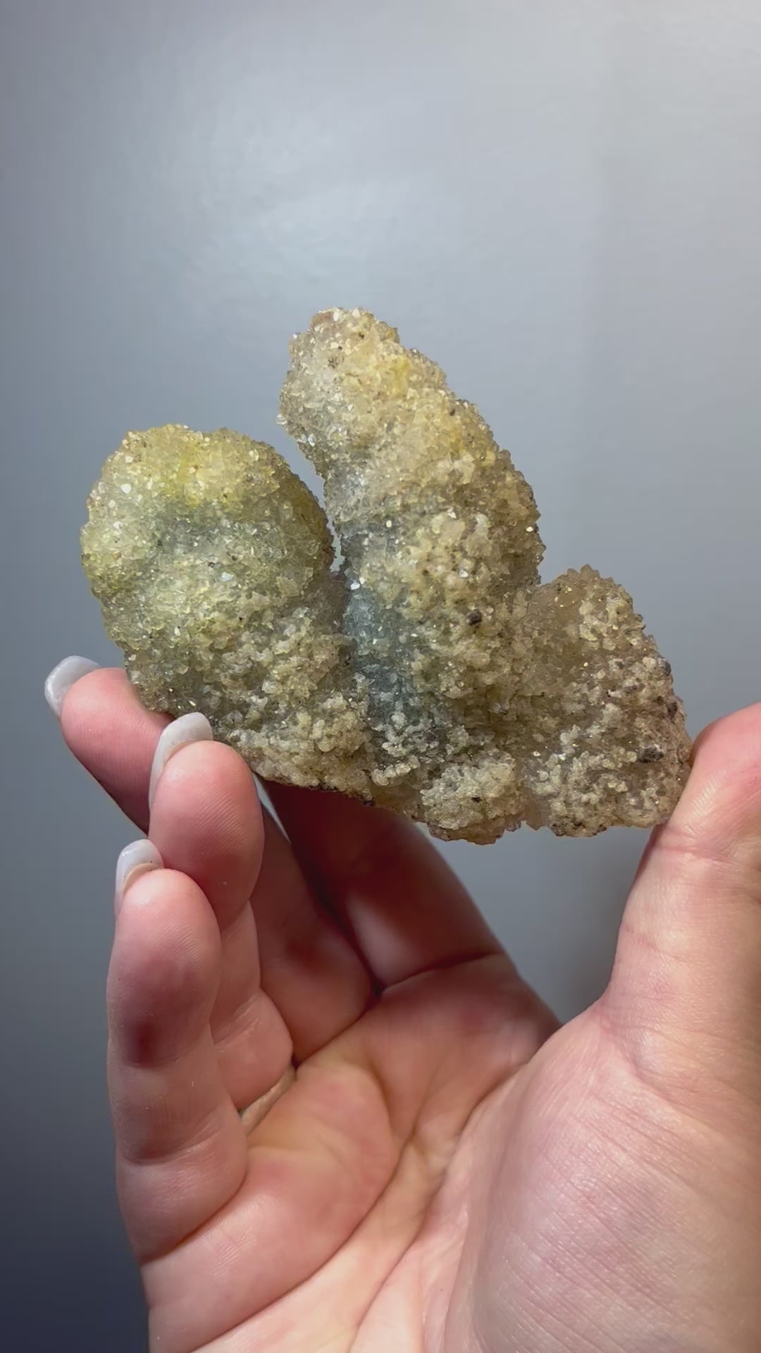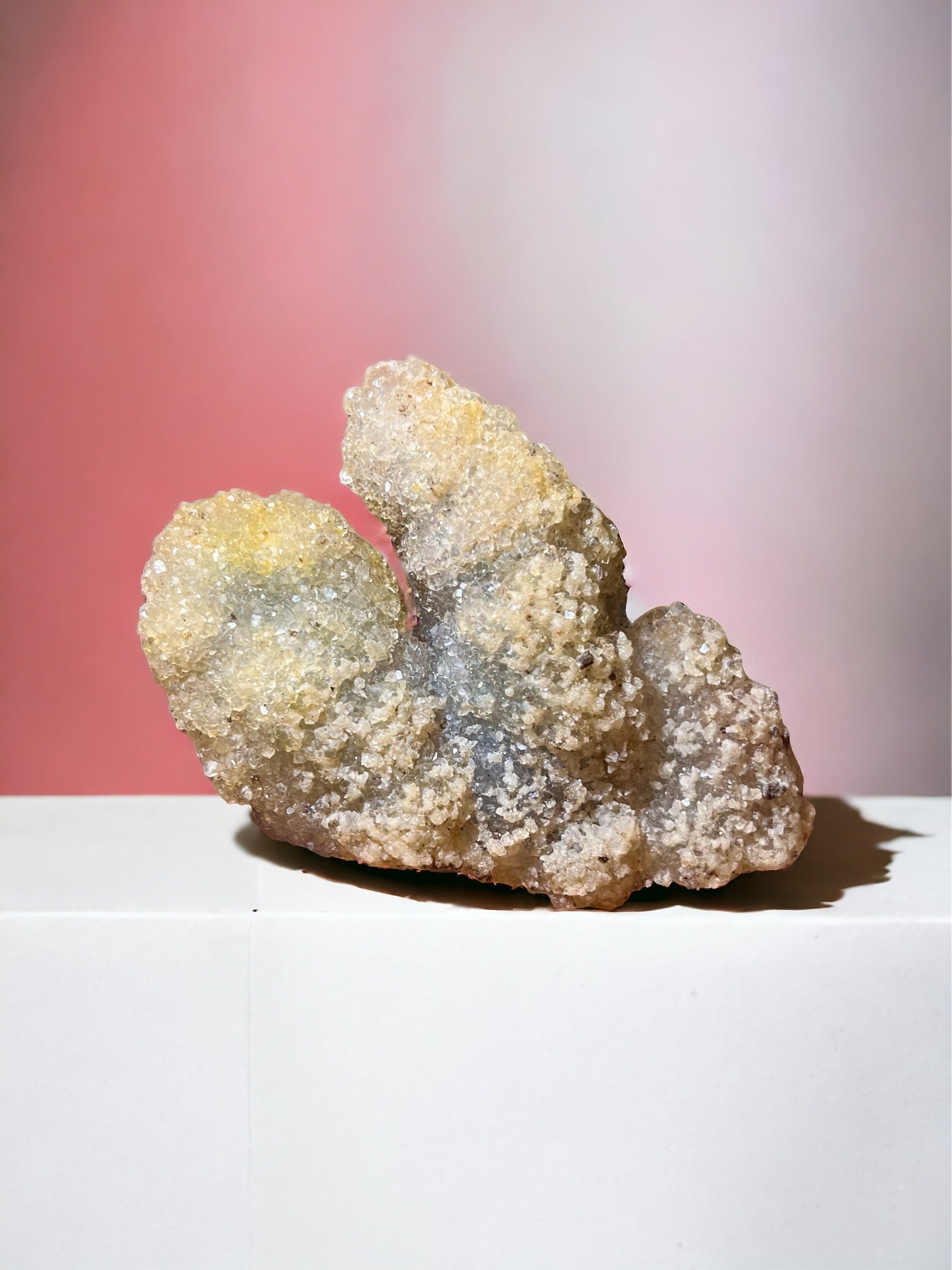 This is a cute lavender amethyst stalactite cluster with golden-colored iron inclusions. The bottom exhibits beautiful swirling agate bandings.