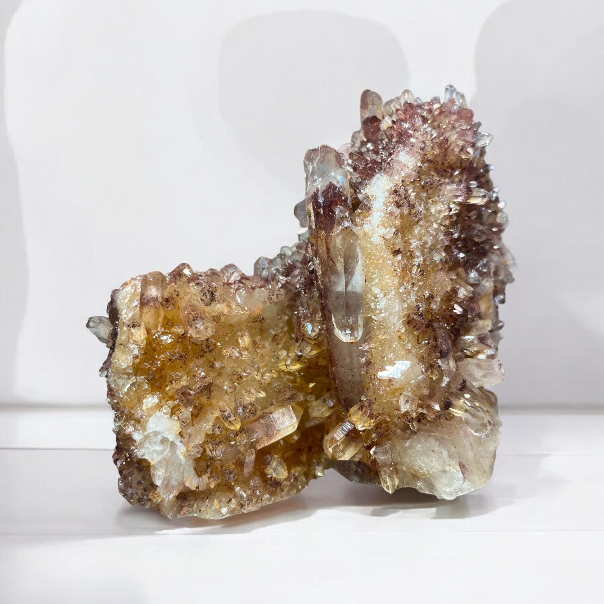 Known as “Sunset Phantom Quartz,” this rare gem can only be found in a single location on Earth. First discovered in 2022, it earns its evocative name from the striking purple-red hematite inclusions suspended within its crystal-clear points, creating a stunning visual effect. The yellow-hued matrix enhances the overall “sunset” aesthetic, making each piece a natural work of art.
