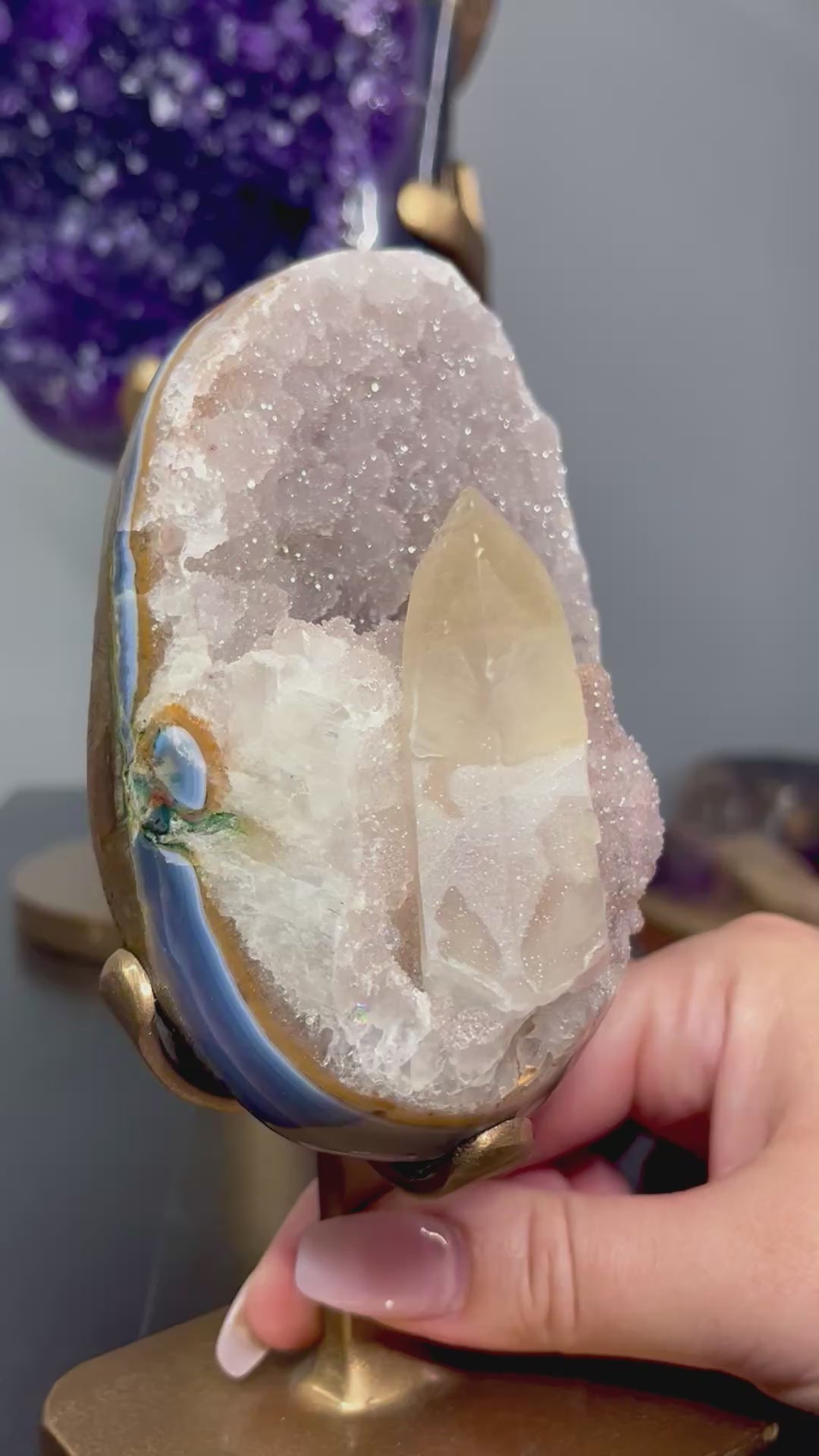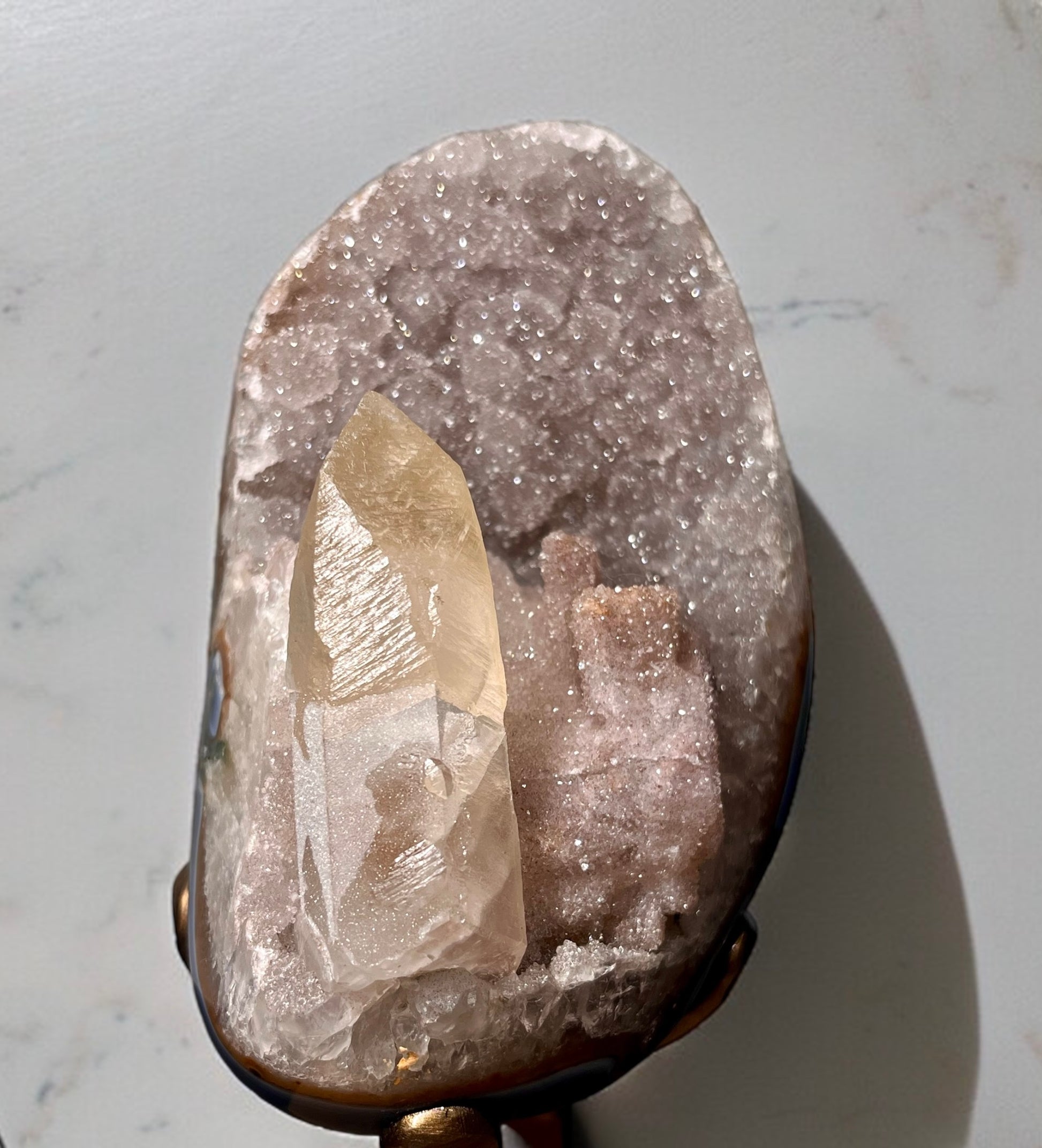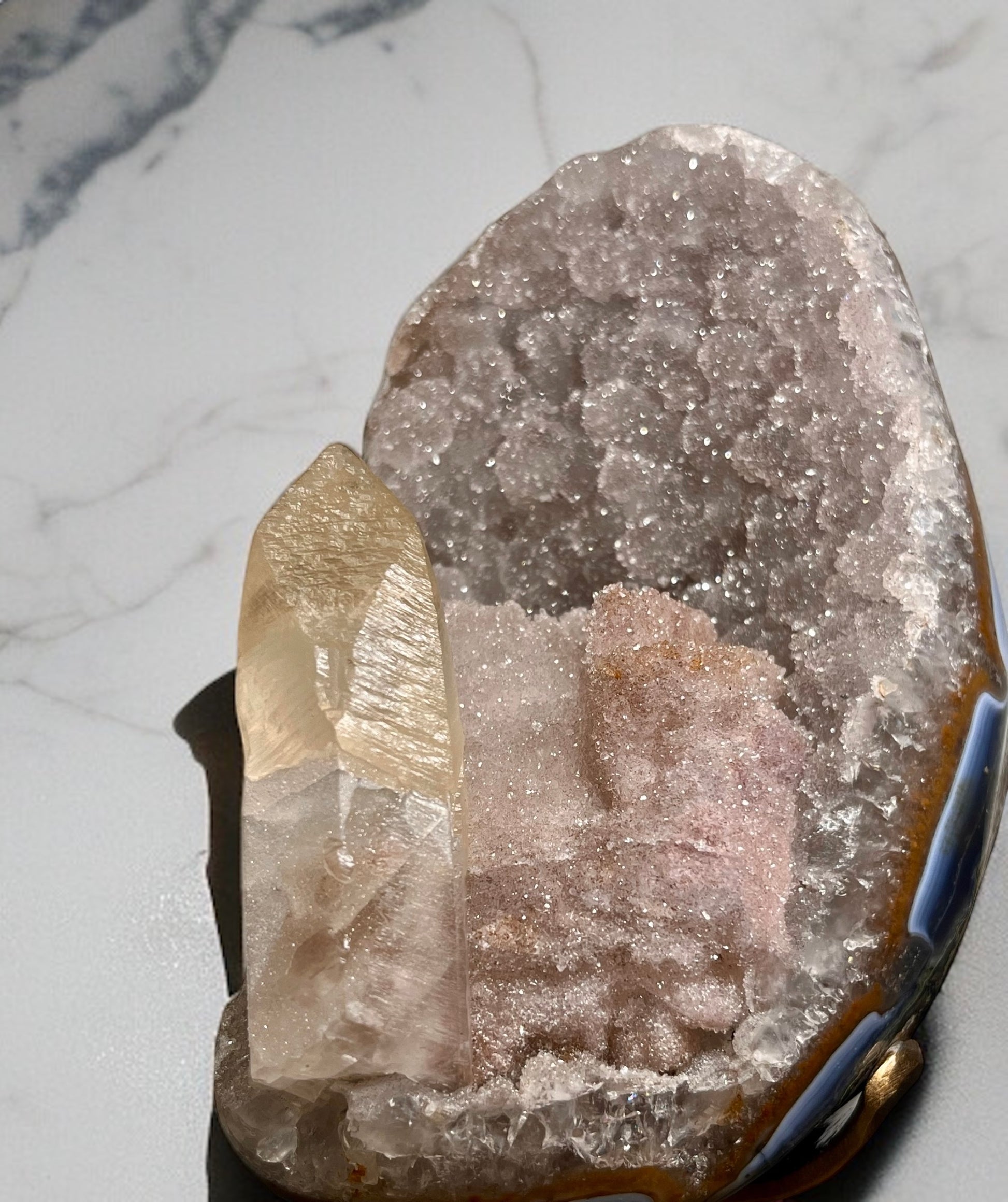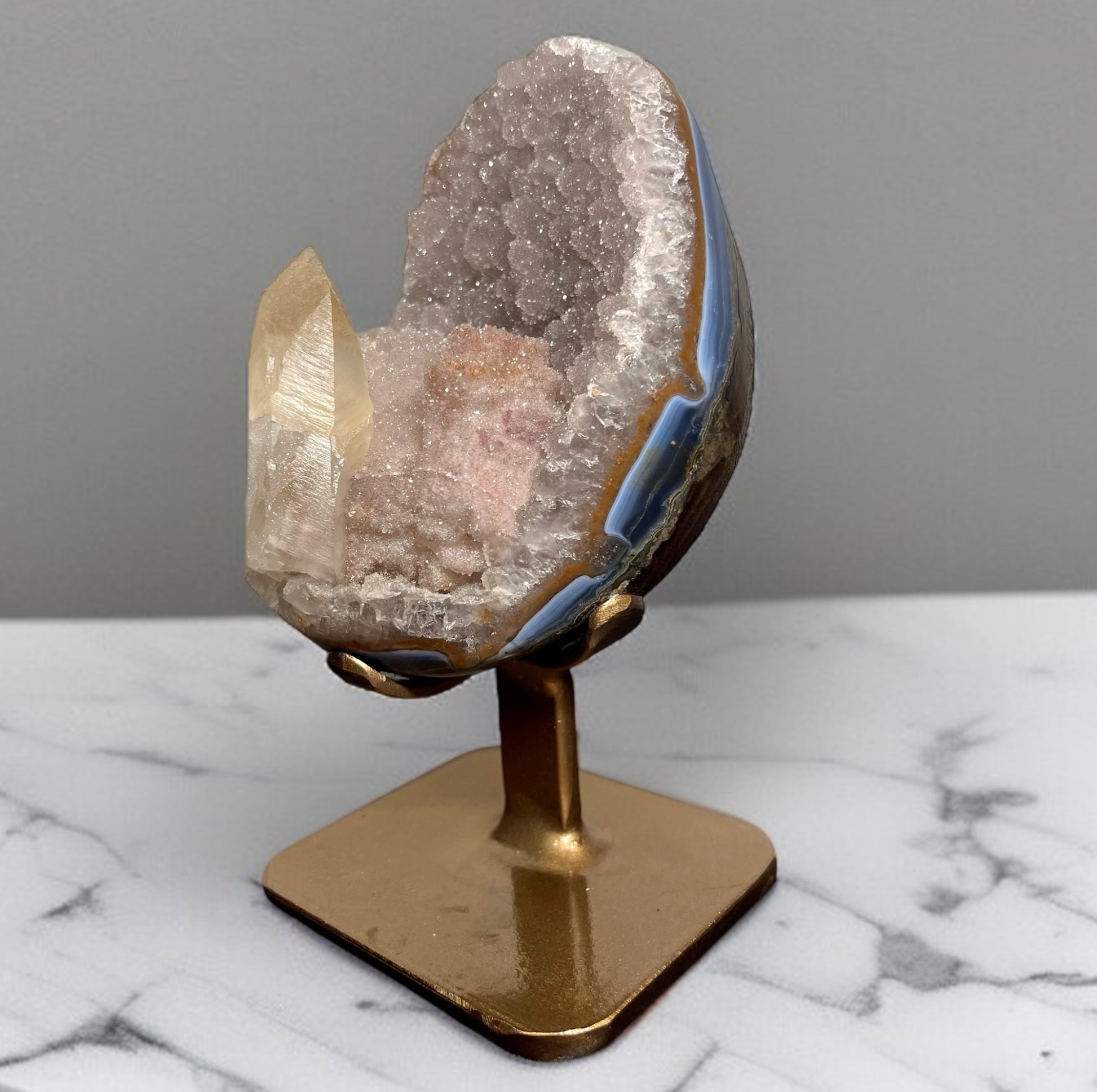 This is one of those pieces you just want to sit with. Soft, sugary pink amethyst, anchored by a golden calcite point, all formed naturally inside a quiet blue agate-banded geode from Uruguay.