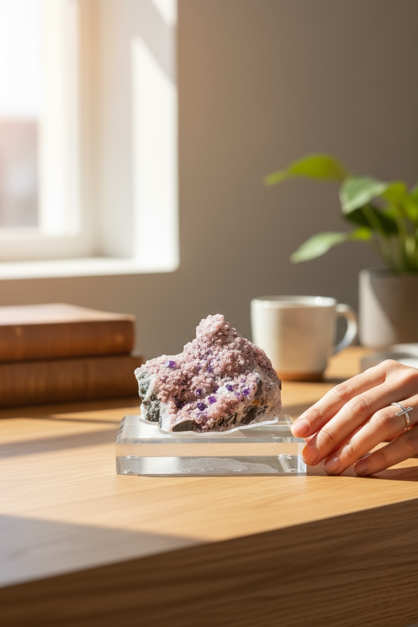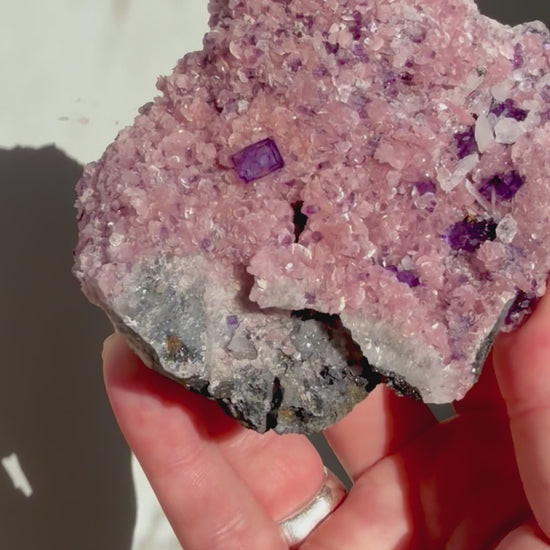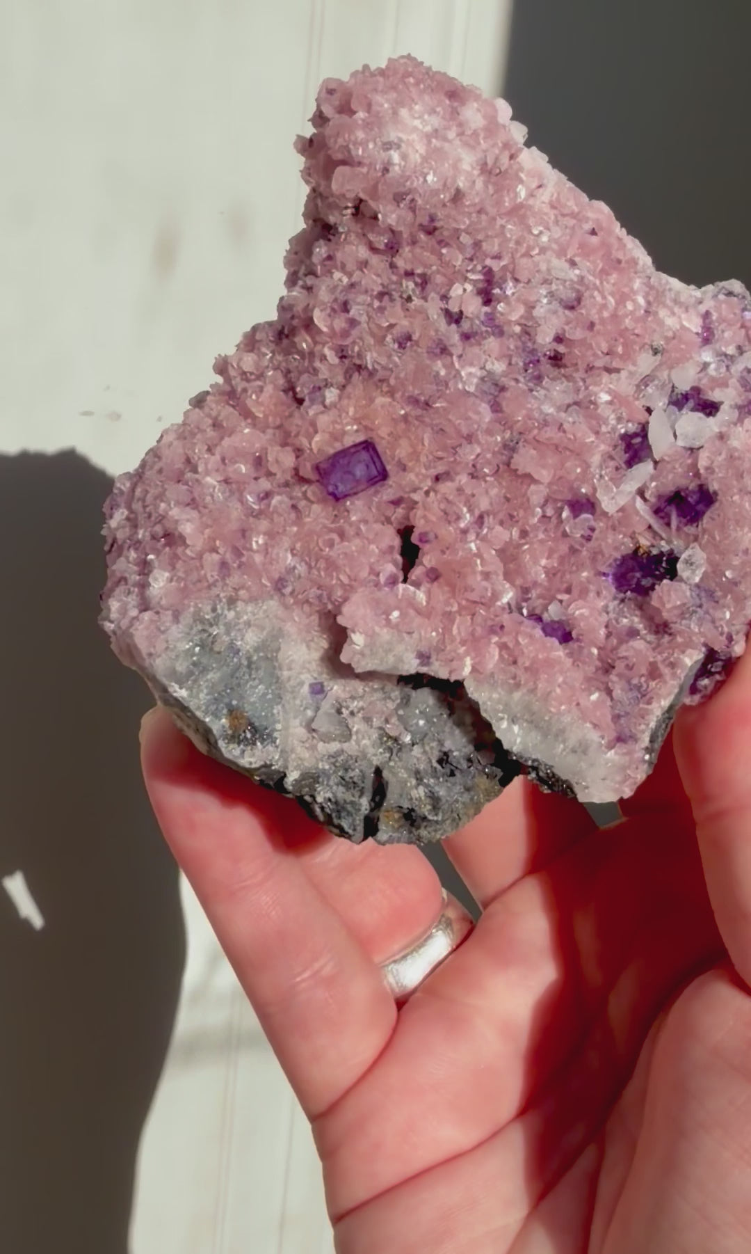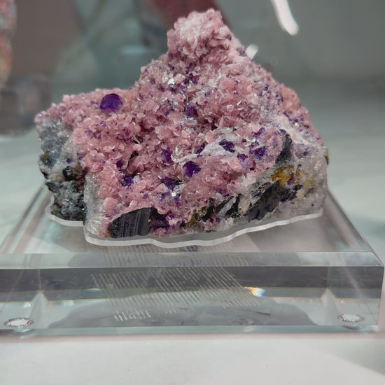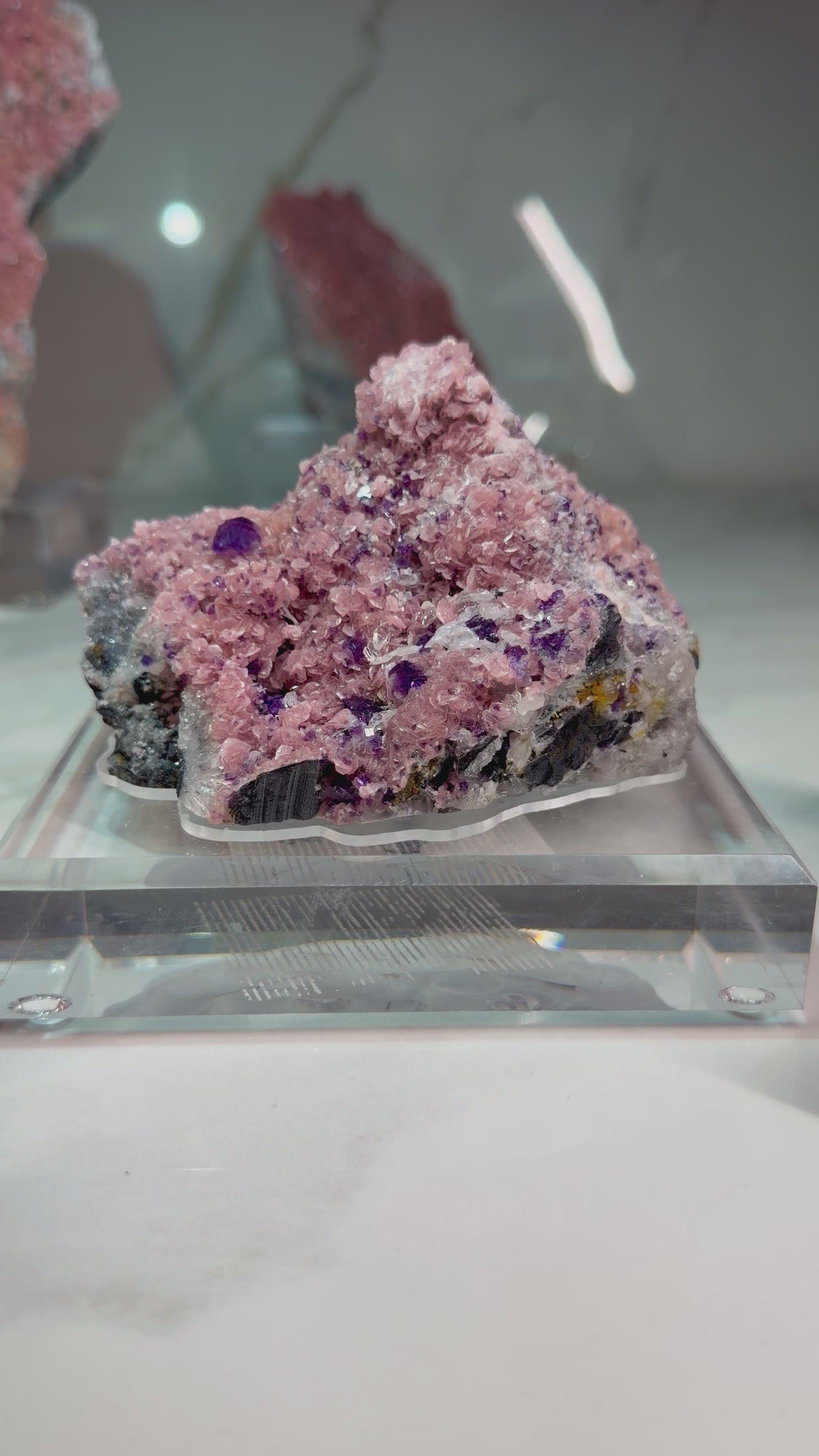 This piece shows off a soft, radiant layer of pink rhodochrosite crystals blanketing a bed of clear quartz, both front and back. Their combination gives the surface a delicate brilliance. Scattered across the rhodochrosite are sharp purple fluorite cubes, perfectly perched and undisturbed while adding bright color contrast and dimension. Beneath the display face, you can find subtle pockets of sparkling pyrite giving the piece even more texture.