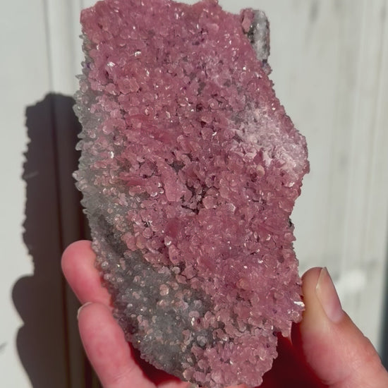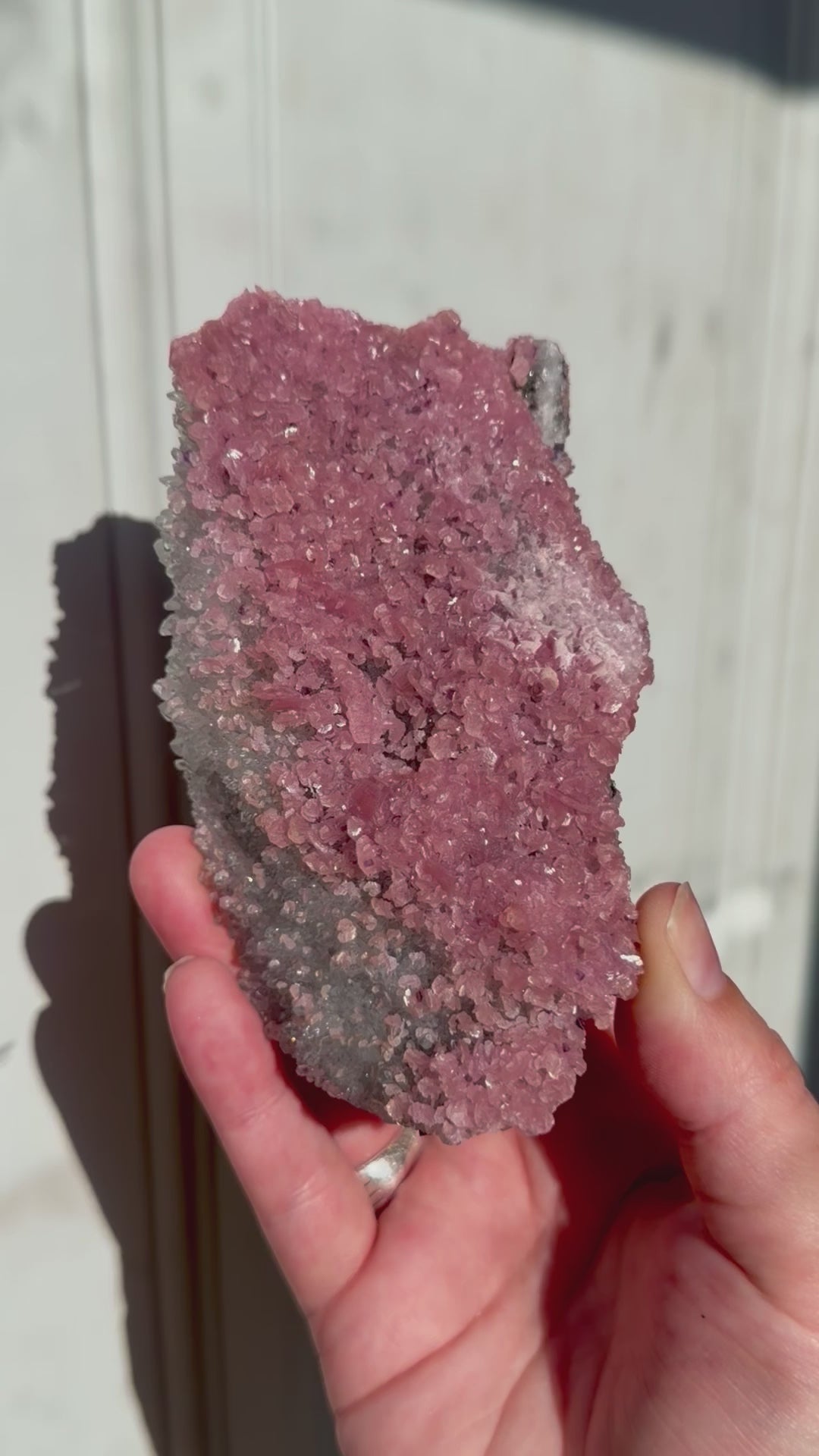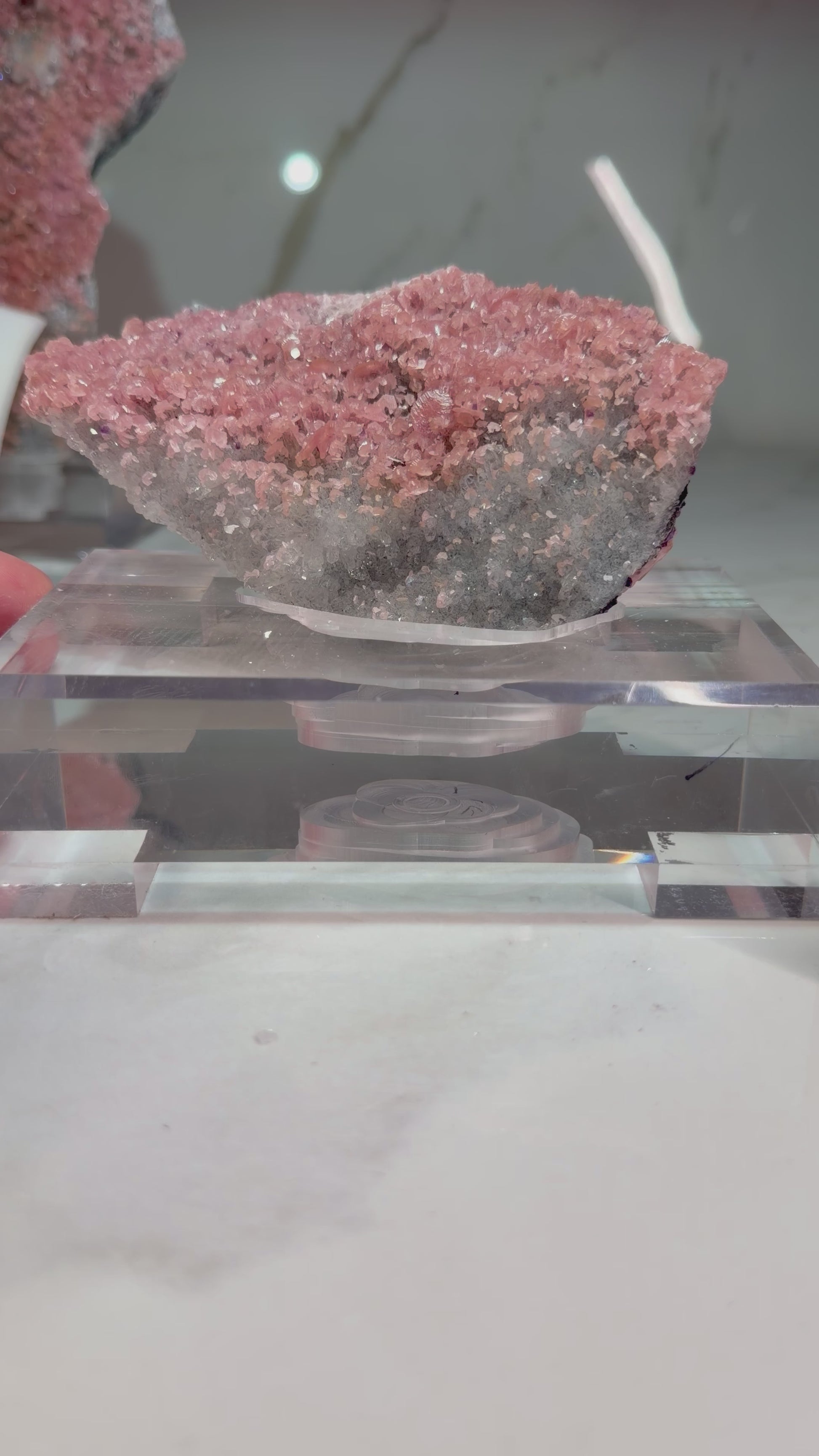 This piece displays a luminous druse of pink rhodochrosite crystals blanketing a foundation of clear to blue-ish quartz. The surface shimmers, transitioning from deeper rose tones near the center to pale blush at the edges. Turning the piece reveals a cluster of purple fluorite cubes on the reverse — a vivid contrast that completes the classic Wutong trio of pink, purple, and clear crystalline hues.
