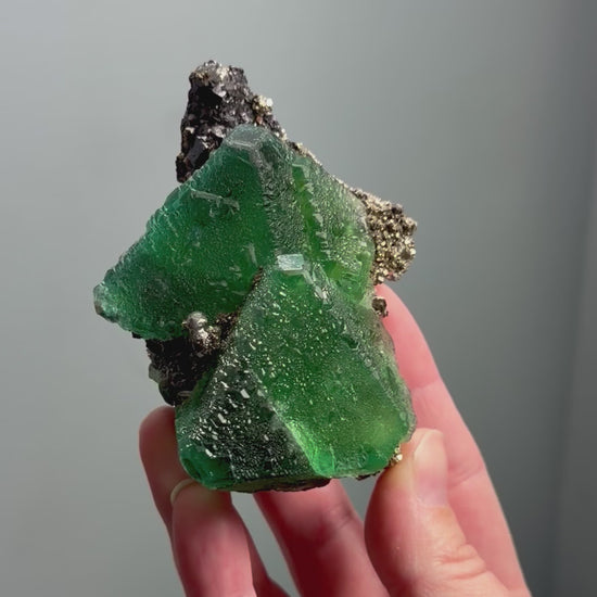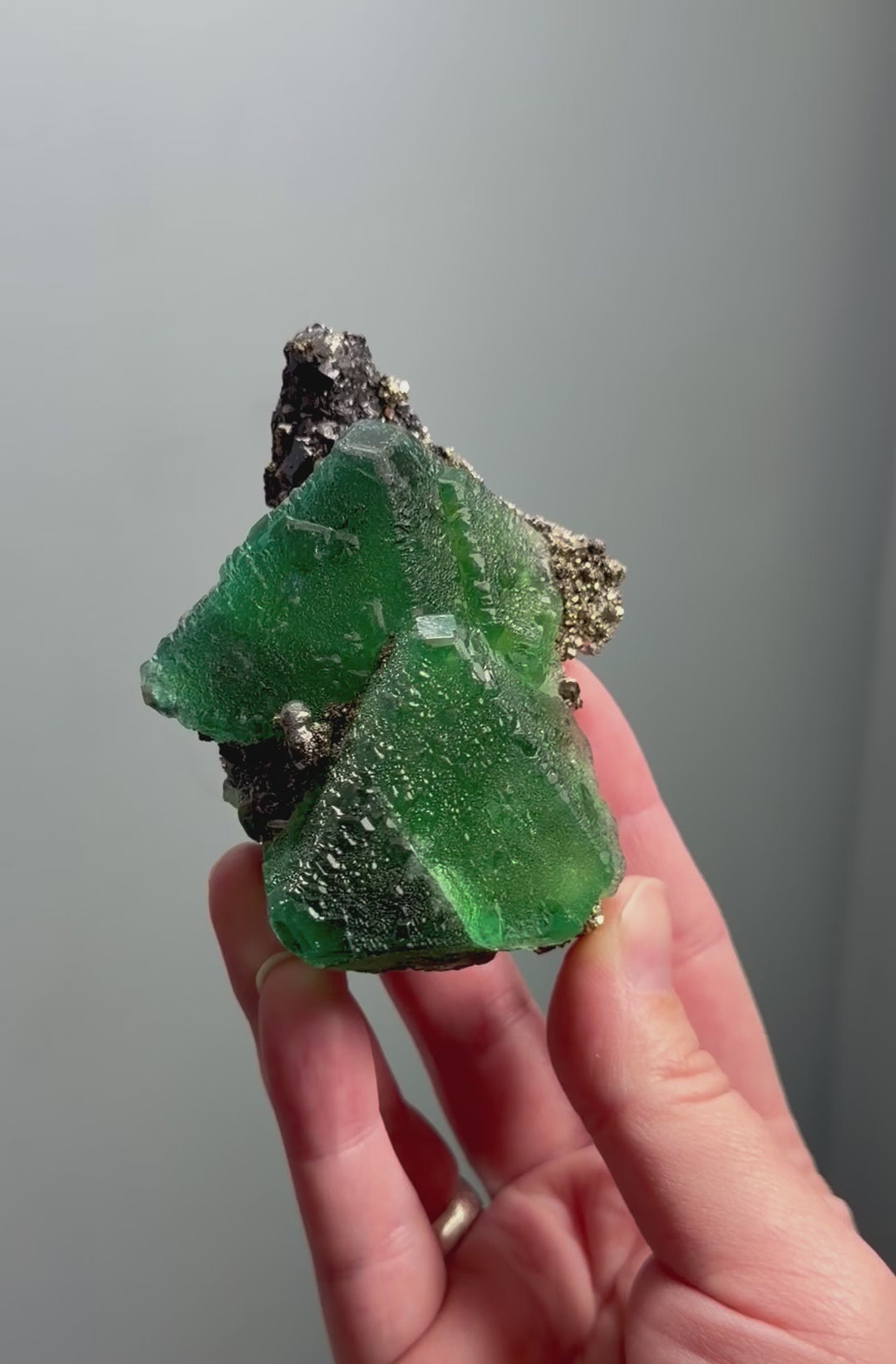What sets this piece apart is the dramatic association with metallic sulfides along the matrix, (pyrite with galena), adding strong visual contrast and anchoring the composition. The sulfides form a metallic, sparkling backdrop that enhances the intricacy of the whole piece.Â