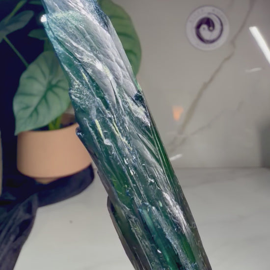 Backlighting pulls light straight through the core, igniting the internal green glow the Amazonas material is known for. Surface striations flash blue when the light hits just right, and the whole piece has that “alive” quality only top-grade vivianite gets.