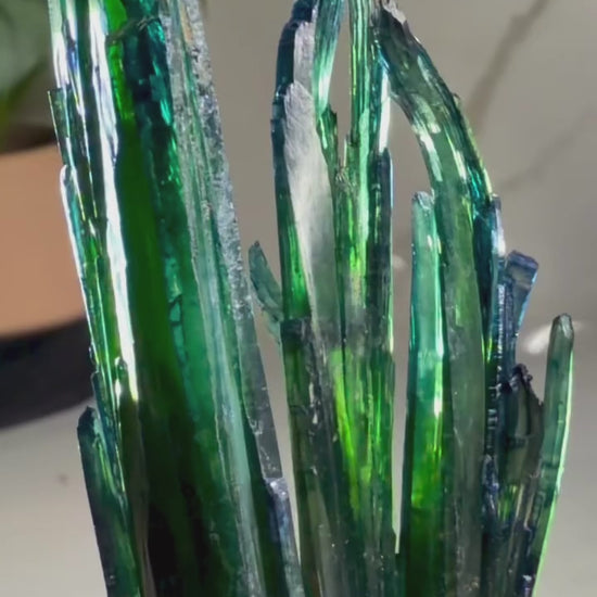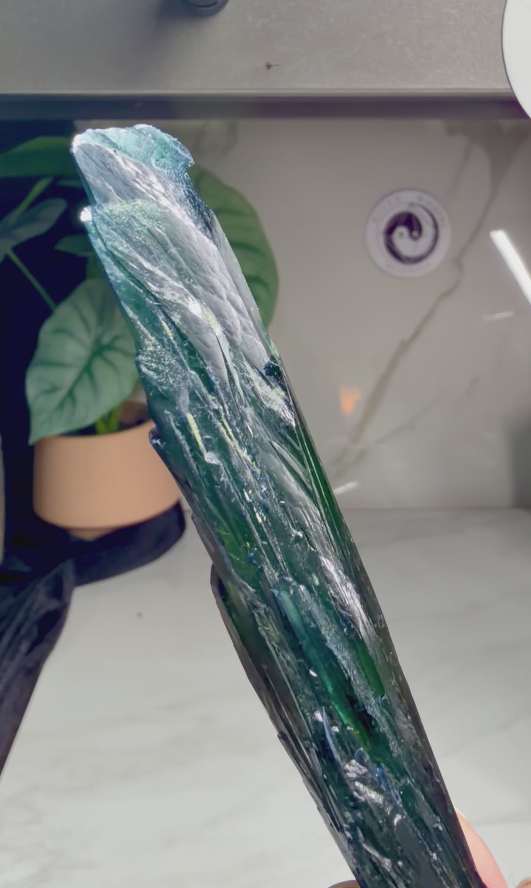The main body rises as a transparent, saturated green spear with metallic blue edges, while the surrounding blades twist upward in a way you almost never see. Several of the tips aren’t broken — they bent during growth! Vivianite is notoriously brittle, so for these arcs to form, the crystal had to still be flexible inside the pocket while under slow, directional pressure. You’re looking at deformation captured mid-growth, not post-extraction damage.