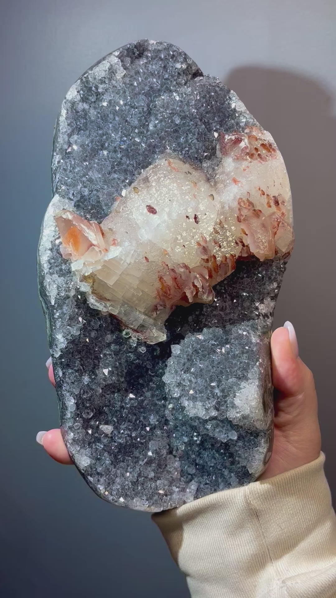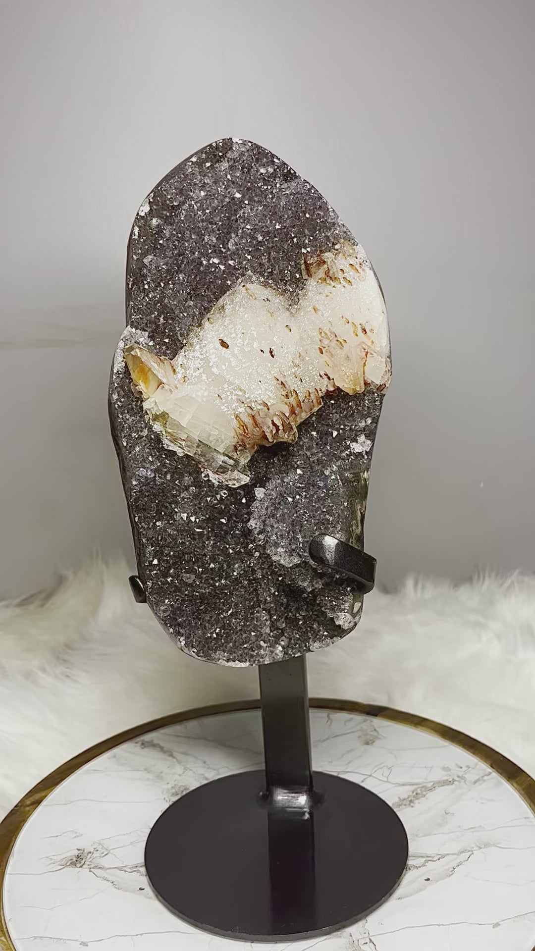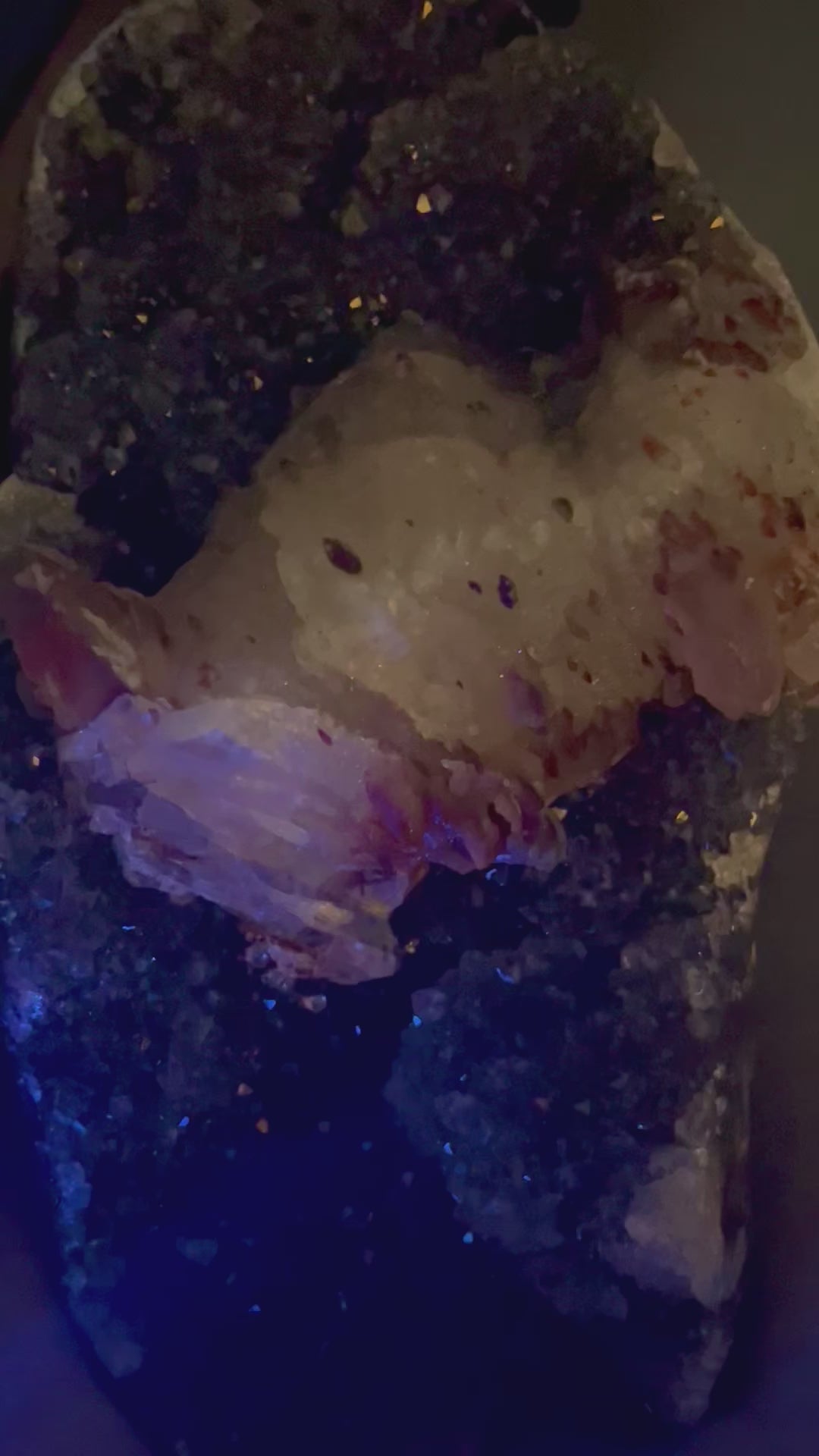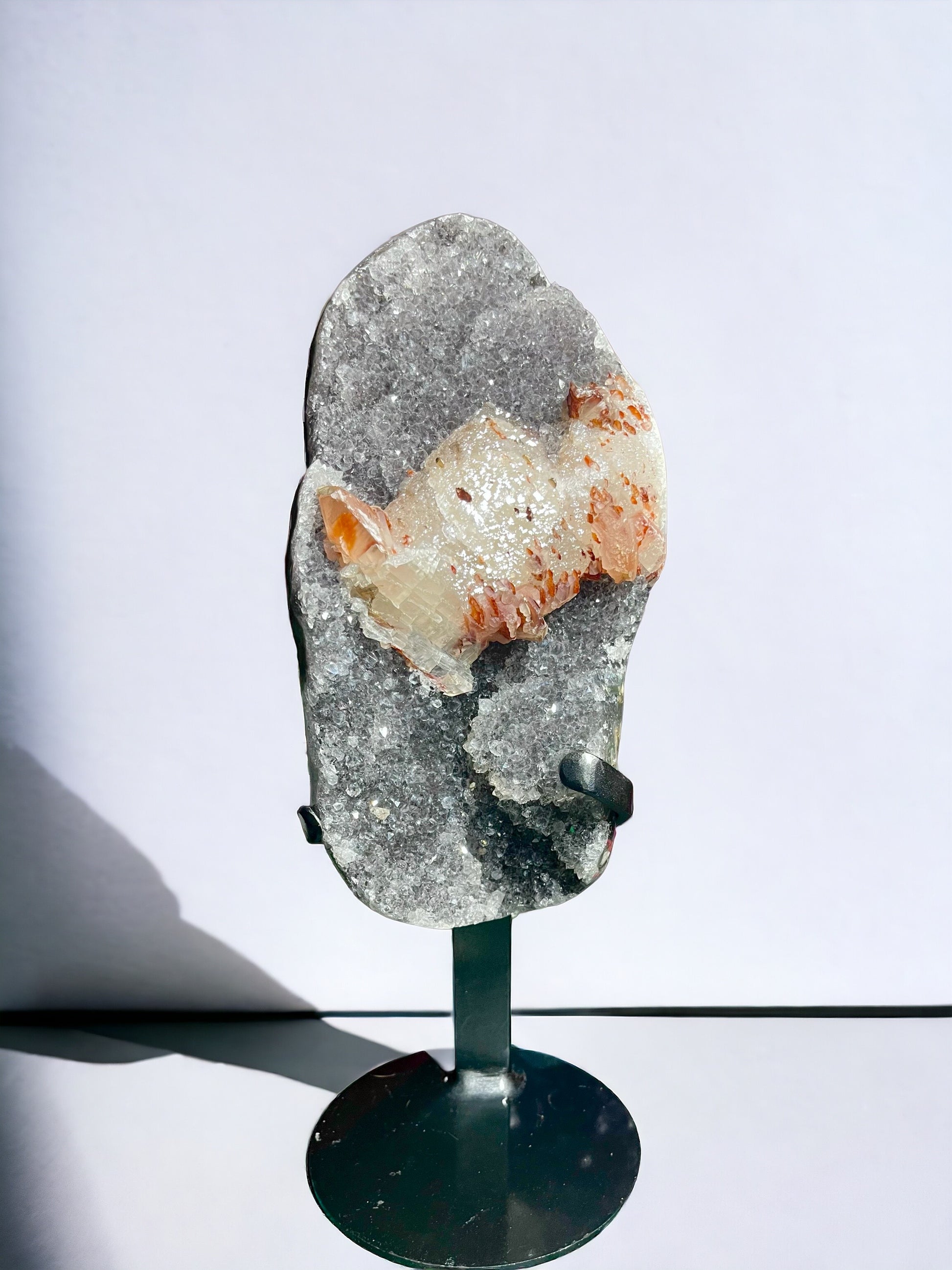 Beautiful amethyst and calcite piece from Artigas, Uruguay. Comes with metal stand. Calcite UVs bright pink!